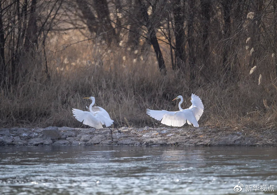 白鹭在汾河湿地公园内嬉戏 新华社记者杨晨光摄