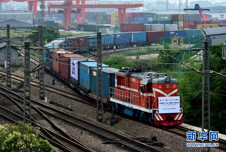 这是2020年6月5日,满载防疫物资的“义新欧”中欧班列(义乌-马德里)在义乌西站启程,前往西班牙首都马德里。新华社发(吕斌 摄)