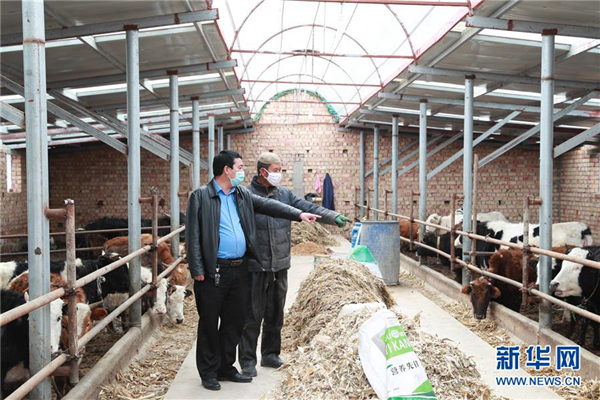 在甘肃省临夏回族自治州广河县庄窠集镇西坪村,全国人大代表马天龙(左)和养牛户马志德讨论养殖问题(3月10日摄)。新华社发(杜哲宇 摄)