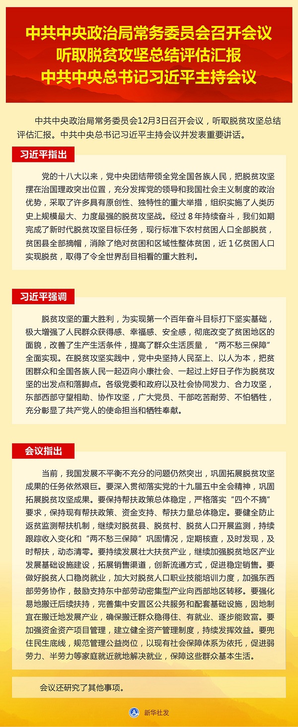 新华社北京12月3日电 中共中央政治局常务委员会12月3日召开会议,听取脱贫攻坚总结评估汇报。中共中央总书记习近平主持会议并发表重要讲话。